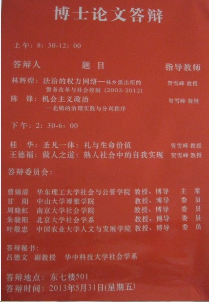 2013年5月31日上午和下午,中心进行了2013届博士论文答辩。这是中心今年进行的第二场博士论文答辩。本次答辩的答辩主席是华东理工大学曹锦清教授,委员为中山大学甘阳教授、南京大学周晓虹教授、北京大学朱晓阳教授、中国农业大学叶敬忠教授。答辩人为林辉煌、陈锋、桂华、王德福。本次答辩吸引了70多名前来旁听答辩的师生。答辩现场气氛紧张而活泼,答辩委员深刻的问题和答辩人睿智的答辩,不时引来阵阵掌声。